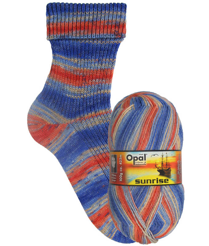This is from the “Sunrise” range of self-patterning coloured Opal sock yarn, first available from us October 2017.