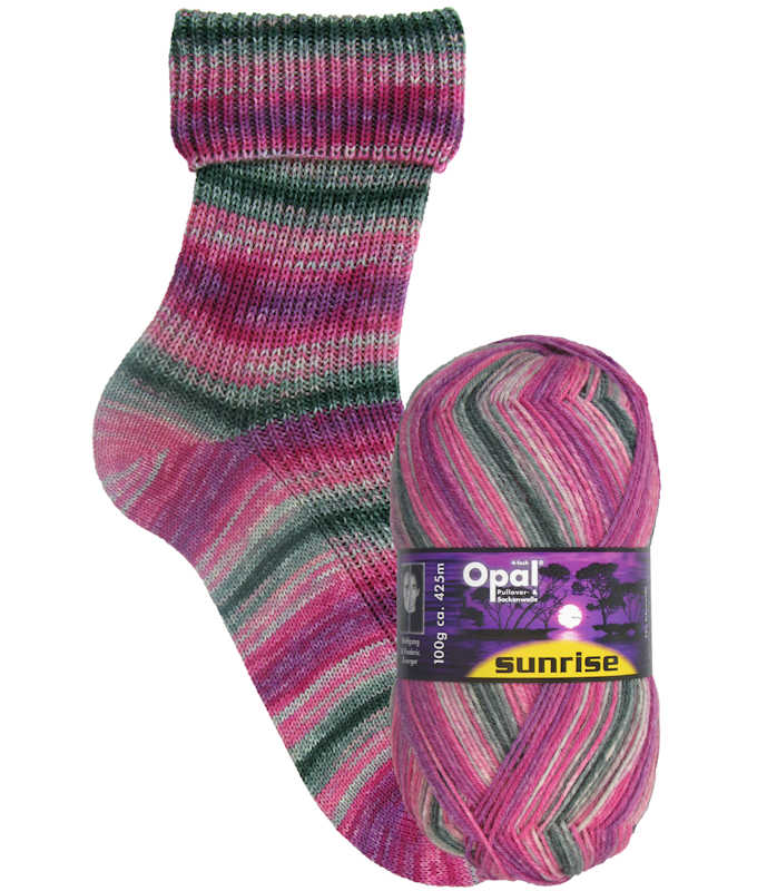 This is from the “Sunrise” range of self-patterning coloured Opal sock yarn, first available from us October 2017.